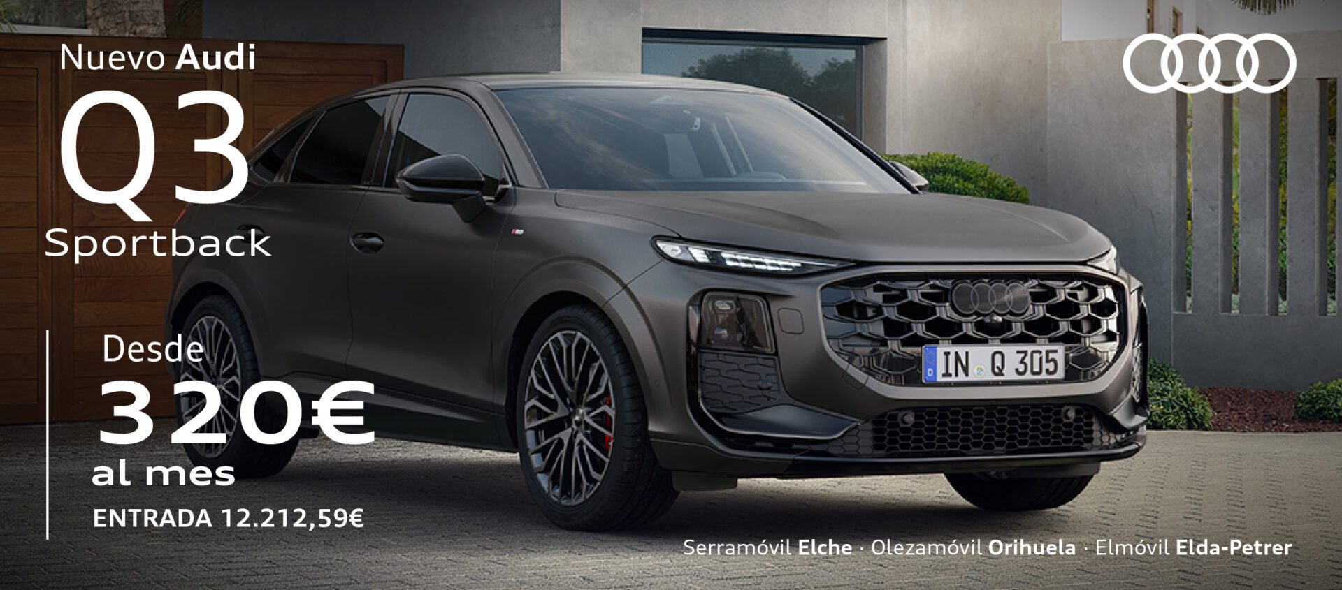 Oferta para un Audi Q3 Sportback Business TFSI 110 kW (150 CV) S tronic con un PVP recomendado financiando en Península y Baleares de 45.609,46€ (IVA, transporte, impuesto de matriculación, descuento de marca y concesionario y bonificación Volkswagen Bank GmbH S.E. incluidos). Oferta de financiación válida para clientes particulares que financien un crédito mínimo de 10.000,00€ con una permanencia mínima de la financiación de 48 meses a través de Volkswagen Bank GmbH S.E. (según condiciones contractuales). Ejemplo: 48 cuotas de 320 € y si lo deseas, al cabo de 4 años podrás cambiarlo por otro modelo, devolverlo o quedártelo pagando la cuota final de 29.922,12€ (calculada con 10.000 km anuales). TAE: 8,90%. La oferta incluye los siguientes servicios opcionales y financiados que no están incluidos como gasto en el cálculo de la TAE. Mantenimiento durante 4 años (o 60.000 kms, lo que suceda primero) Audi fulldrive Entry por 600€ y 1 año de seguro todo riesgo (con franquicia de 300 €) por 250€. Entrada: 12.212,59€. Importe total financiado: 34.914,68€. Comisión de apertura financiada: 1,95% (667,81€). TIN: 7,95%. Importe de los intereses: 10.367,44€. Coste total del crédito: 11.035,25€. Importe total adeudado: 45.282,12€. Precio total a plazos: 57.494,71€. Precio al contado: 46.109,46€. Precio financiando 45.609,46€. Sistema de amortización francés. En el caso de que exista algún descuadre en los intereses, el cliente abonará los importes indicados en la publicidad. El modelo visualizado puede no corresponder exactamente con el ofertado. Oferta válida hasta el 28/02/2026 ofrecida por Audi Financial Services, marca comercializada por Volkswagen Bank GmbH S.E. Avda. Bruselas, 34 – 28108 Alcobendas. Reg. Mercantil de Madrid. Tomo 16828, Sección 8, Folio 184, Hoja M-287573, Inscrita con el nº 1480 del Reg. Especial del Banco de España – CIF. W-00427411.